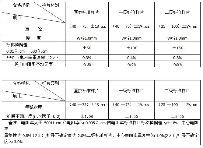 硅單晶電阻率標準片(以下簡稱標準樣片)是用高純多晶硅,經過單晶設備,再經中子嬗變摻雜等多種工藝制造的,具有一定幾何尺寸的實物標準.由不確定度已知的標準裝置,對該實物標準的電阻率及其他指標給予標定,使用時以標準樣片為準,對相關參數進行量值傳遞. 標準樣片的各項指標要求: 標準樣片的表面質量及幾何尺寸: