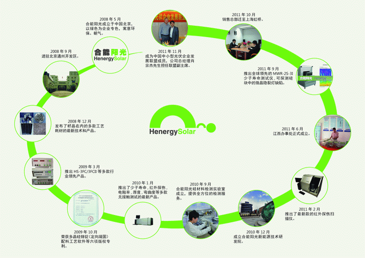 北京合能陽光新能源技術有限公司,由肖宗杰先生成立于2008年,公司注冊資本1000萬,先后成立了硅材料檢測實驗室和新能源技術研發院,提供從硅料、單晶硅棒、多晶硅塊、硅片、電池片乃至組件電站全方位的檢測服務。針對客戶實際情況制定適合的檢測方案。 公司的多晶鑄錠檢測設備已被包括英利、海潤、賽維LDK、晶科等數百家家光伏企業采用。產品出口美國、歐洲等國家地區,和海外建立產品加工合作關系。